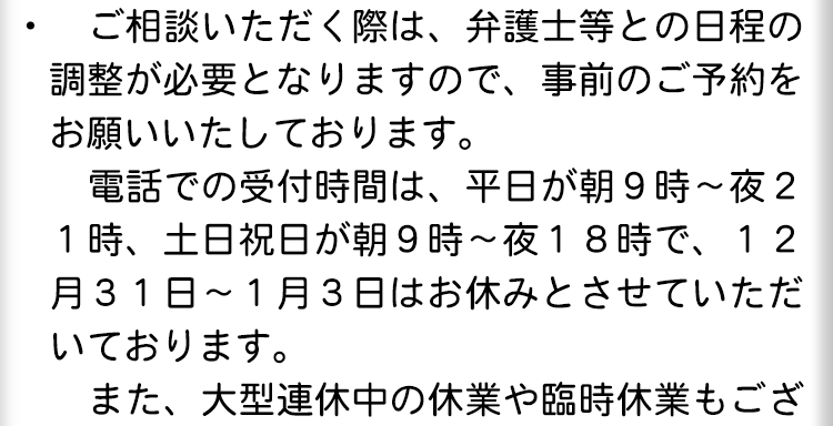 夜間・土日祝の相談も対応します(要予約)
