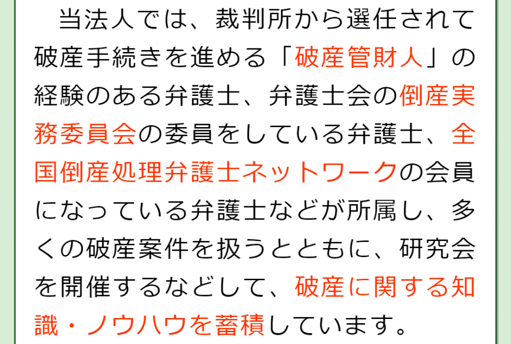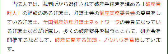 「企業法務」で検索すると、取引先とのトラブルや契約書の作成に強い弁護士である可能性もあり、マンパワーが必要な会社の破産には向いていないケースもあるので注意が必要です。