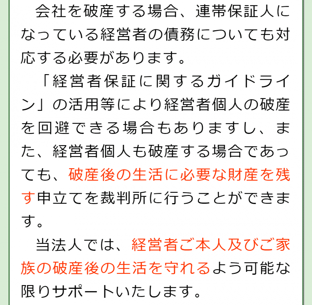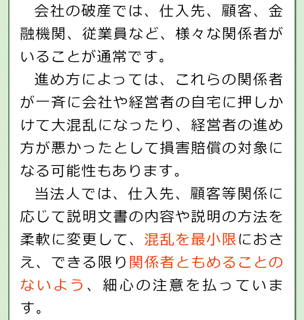 不用意な発言をして破産手続きに支障が生じるような事態も防ぐことができますし、なにより経営者の方がご自分で対応しなくてもよくなるため、精神的なご負担が軽減されるかと思います。