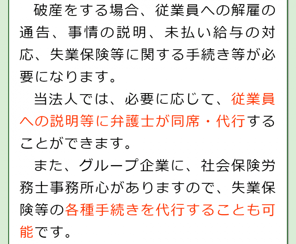 また、ご相談後、当法人に会社破産の手続きをご依頼いただければ、弁護士がお客様の代理人として手続きを進めることが可能になります。