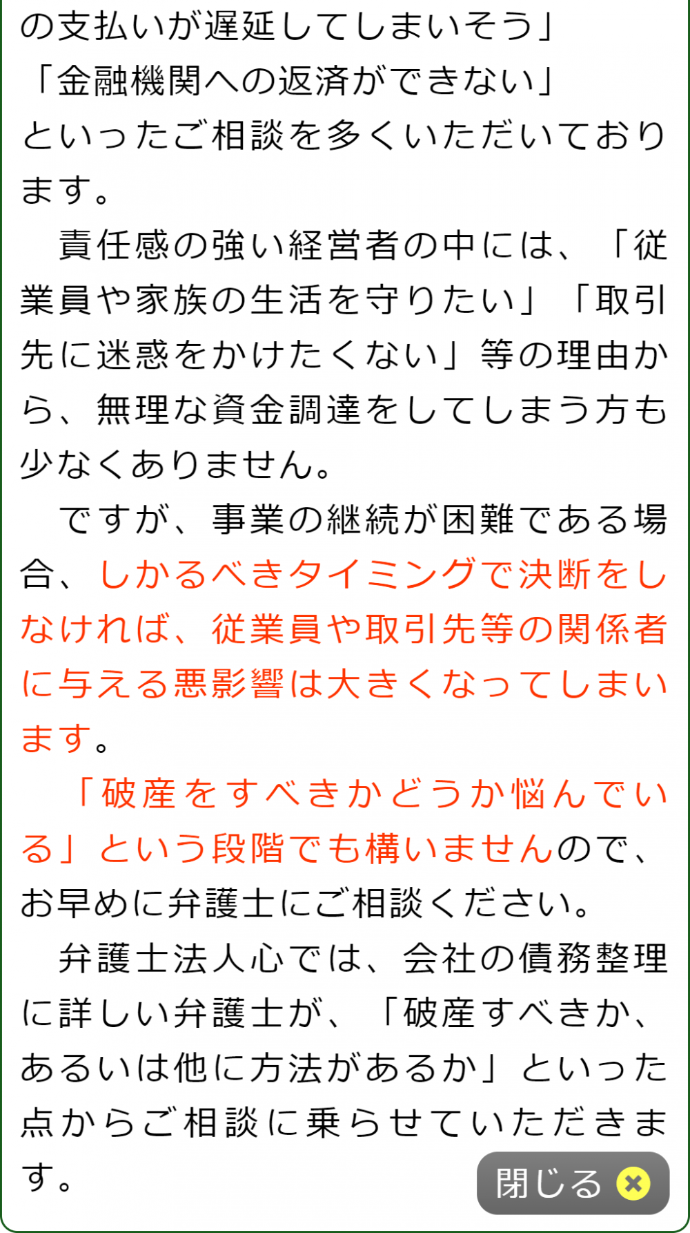 ただ、弁護士会の法律相談では、会社破産に特化した相談は基本的にないので、会社破産に詳しくない弁護士に当たる可能性の方が高いでしょう。