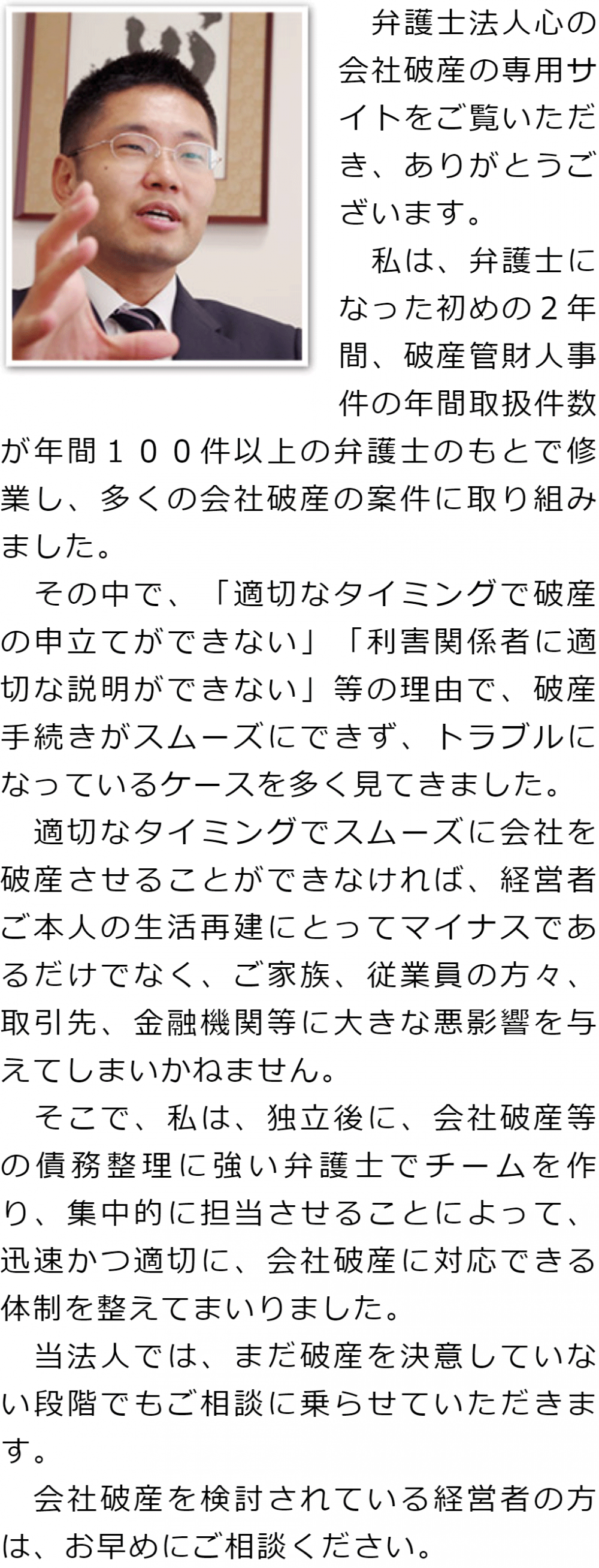 トップその他代表メッセージ 階層構造▼ その他(目次) 代表メッセージ その他(目次)その他トップ共通バナー元※削除不可新着情報(心グループニュース)電話・テレビ電話相談について代表メッセージ相談するタイミングを迷われている方へ金融機関との関係を壊したくない方へお客様相談室グループ概要費用詳細心グループのメディア出演実績マスコミ関係者の方へ関連リンクプライバシーポリシー 受付時間 平日 9時~21時、土日祝 9時~18時 夜間・土日祝の相談も対応します(要予約) 所在地 〒060-0808 北海道札幌市北区北八条西4‐1-1パストラルビルN8 2F 0120-41-2403 お問合せ・アクセス・地図