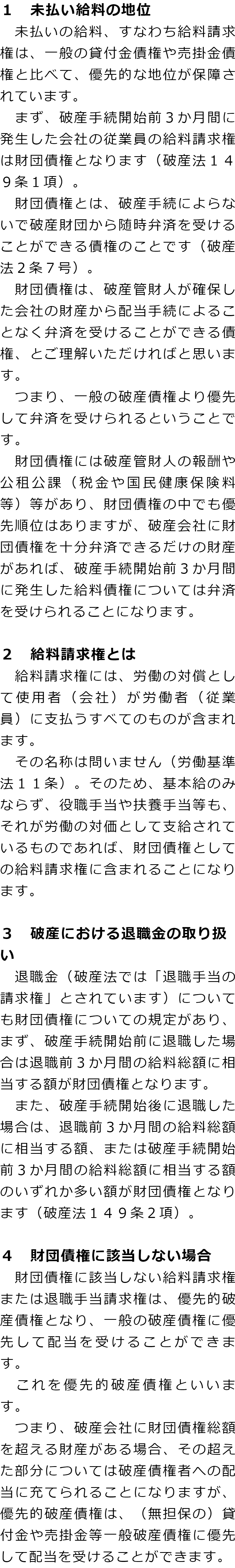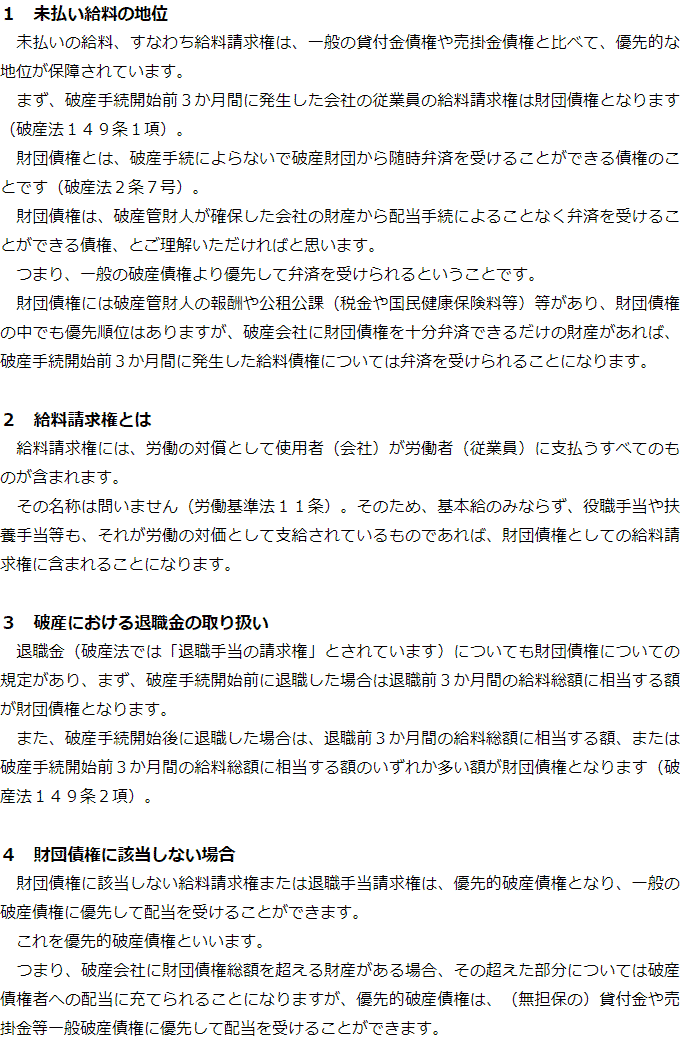 トップお役立ち情報・Q&AQ&A会社が破産した場合の未払いの給料に関するQ&A 階層構造▼ お役立ち情報・Q&A(目次) 会社が破産した場合の未払いの給料に関するQ&AQ会社が破産した場合、未払いの給料はどうなりますか?Q破産手続きの中で従業員が未払い給料の支払いを受けられない場合、何か救済制度はないのですか? Q会社が破産した場合、未払いの給料はどうなりますか?AQ破産手続きの中で従業員が未払い給料の支払いを受けられない場合、何か救済制度はないのですか?A お役立ち情報・Q&A(目次)お役立ち情報・Q&Aトップお役立ち情報会社破産を弁護士に依頼することで取り立ては止まるかQ&A会社が破産した場合の未払いの給料に関するQ&A 受付時間 平日 9時~21時、土日祝 9時~18時 夜間・土日祝の相談も対応します(要予約) 所在地 〒060-0808 北海道札幌市北区北八条西4‐1-1パストラルビルN8 2F 0120-41-2403 お問合せ・アクセス・地図