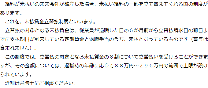 Q破産手続きの中で従業員が未払い給料の支払いを受けられない場合、何か救済制度はないのですか?A お役立ち情報・Q&A(目次)お役立ち情報・Q&Aトップお役立ち情報会社破産を弁護士に依頼することで取り立ては止まるかQ&A会社が破産した場合の未払いの給料に関するQ&A 受付時間 平日 9時~21時、土日祝 9時~18時 夜間・土日祝の相談も対応します(要予約) 所在地 〒060-0808 北海道札幌市北区北八条西4‐1-1パストラルビルN8 2F 0120-41-2403 お問合せ・アクセス・地図