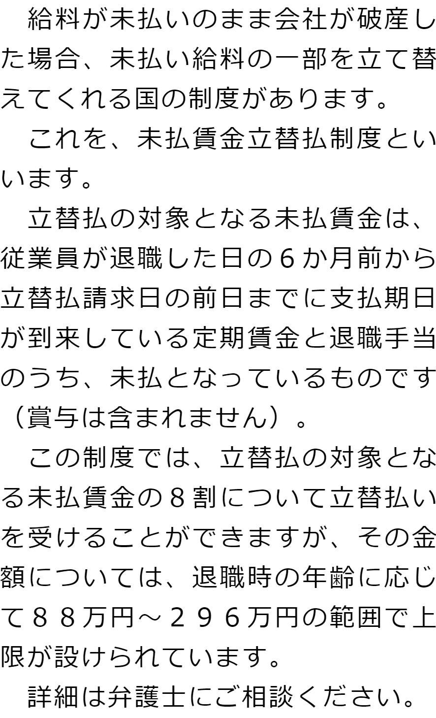 Q会社が破産した場合、未払いの給料はどうなりますか?AQ破産手続きの中で従業員が未払い給料の支払いを受けられない場合、何か救済制度はないのですか?A お役立ち情報・Q&A(目次)お役立ち情報・Q&Aトップお役立ち情報会社破産を弁護士に依頼することで取り立ては止まるかQ&A会社が破産した場合の未払いの給料に関するQ&A 受付時間 平日 9時~21時、土日祝 9時~18時 夜間・土日祝の相談も対応します(要予約) 所在地 〒060-0808 北海道札幌市北区北八条西4‐1-1パストラルビルN8 2F 0120-41-2403 お問合せ・アクセス・地図